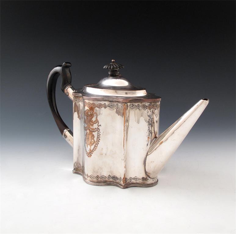A George III old Sheffield plated teapot, unmarked, circa 1790, shaped oval form, engraved borders, and with two shields and monograms, scroll handle, domed hinged covers with a fluted finial, length handle to spout 28.4cm.