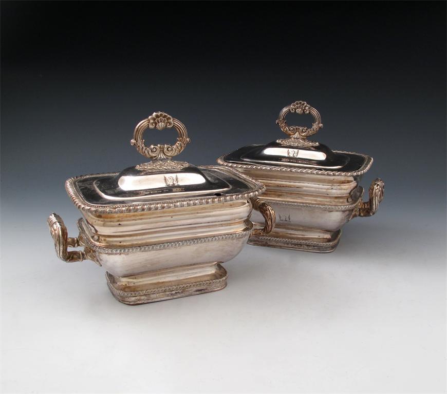 rounded rectangular form, gadroon borders, engraved with a crest, the pull off covers with foliate scroll handles, length 18.5cm. (2)