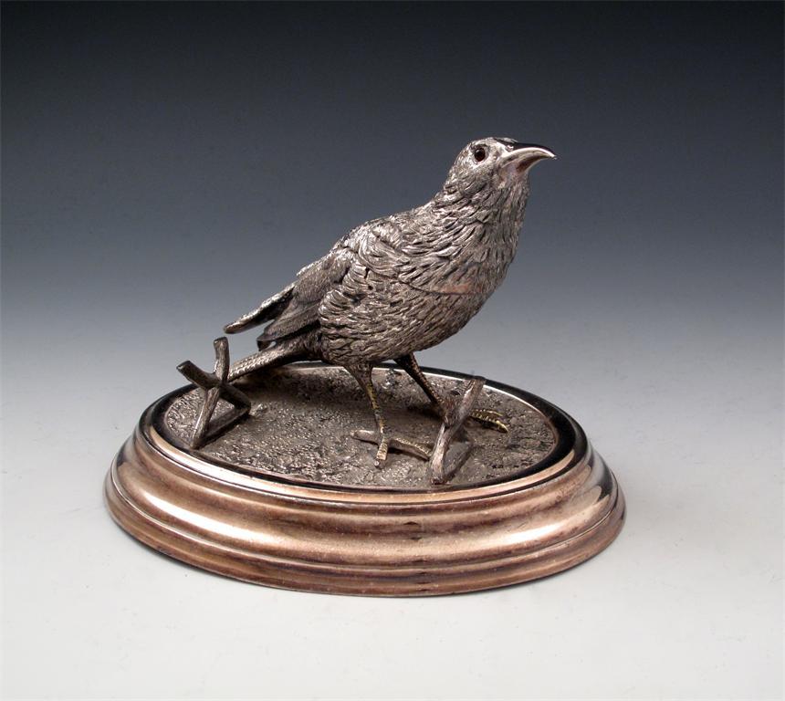 A late Victorian electroplated novelty inkstand, by James Deakin and Sons, modelled as a blackbird, hinged cover, with glass eyes, on a raised oval base with a pen rest, length 19cm.