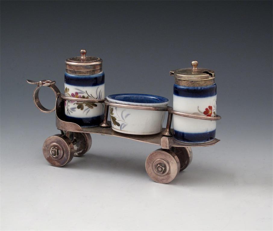 on four wheels with a strap ring handle, with a ceramic mustard pot, salt cellar and pepper pot, with floral design, length 19.5cm.