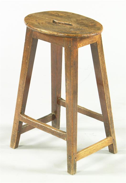 A late George III elm and alder oval top stool, with a pierced handgrips, one stretcher replaced, 19.5in (49.5cm) h, 12.5in (31.6cm) w, 9.75in (24.7cm) d.