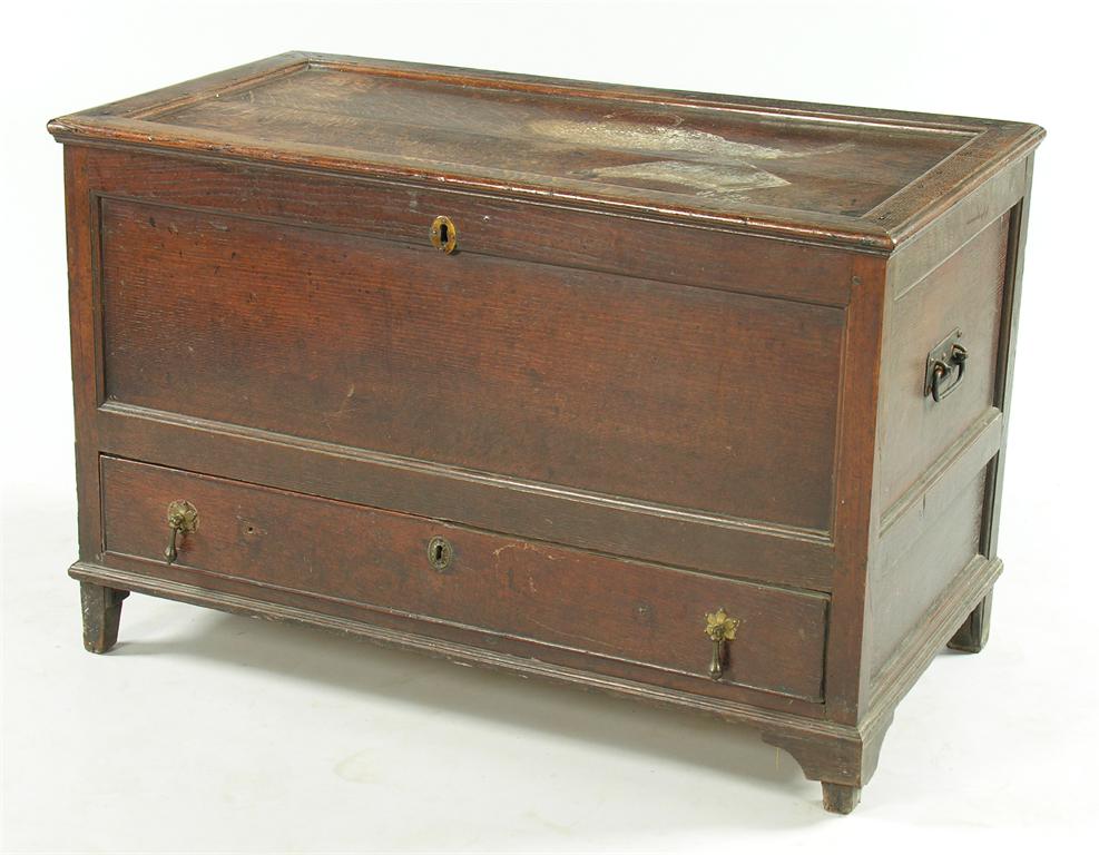An 18th century panelled oak mule chest, the hinged top to an interior with missing base, to a drawer, later handles, 26in (66cm) h, 40in (101.5cm) w, 21.25in (54cm) d.