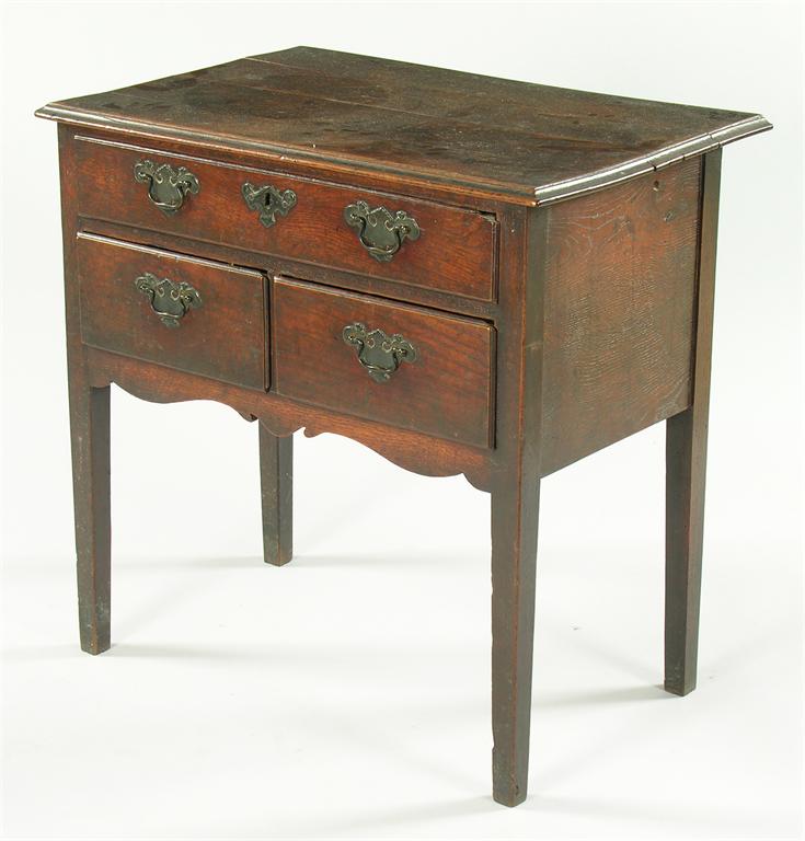 A George III oak lowboy, the moulded edge board top above three drawers, fitted brass plate handles above a shaped apron, 29.5in (75cm) h, 30.25in (76.8cm) w, 20in (50.6cm) d. Lower drawers re-lined.