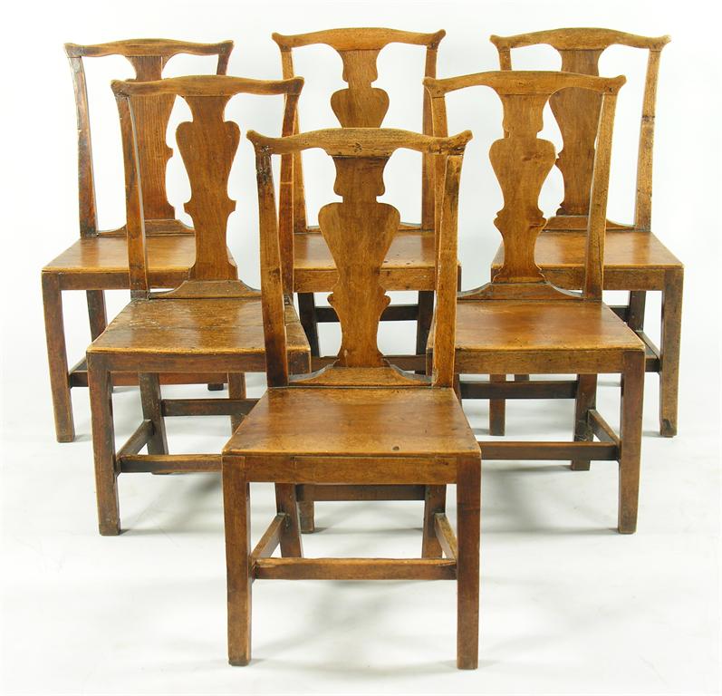 A harlequin set of six 19th century side chairs, with similar vase shape splats, four in alder and two in ash. (6)