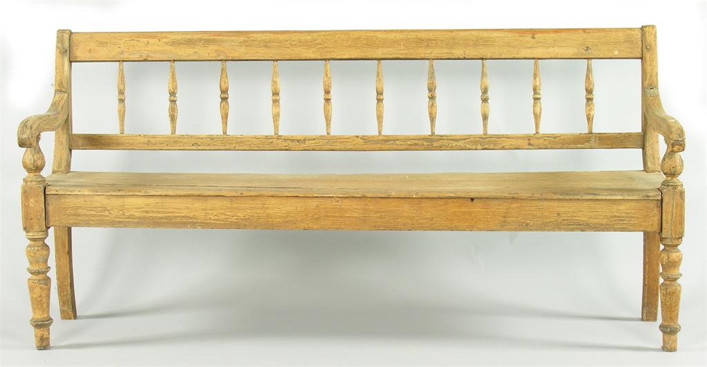 A 19th century painted pine long seat, with a spindle back, 35in (89cm) h, 71in (180.4cm) w, 21in (53.2cm) d.