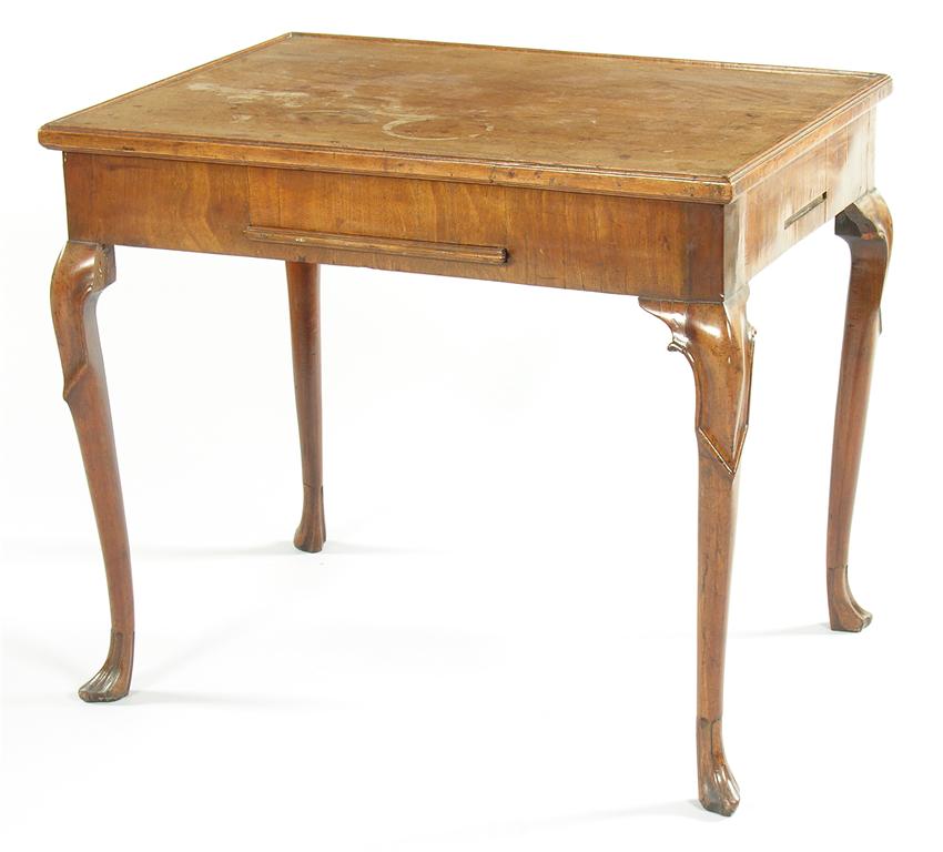 A mid 18th century walnut games table, the reversable top baize lined with counter wells, to an inlaid backgammon board, the front frieze with a chequer board slide, the side with candle slides, on moulded capped cabriole legs to faceted feet, 27in (68.5cm) h, 31in (78.8cm) w, 23in (58.4cm) d.