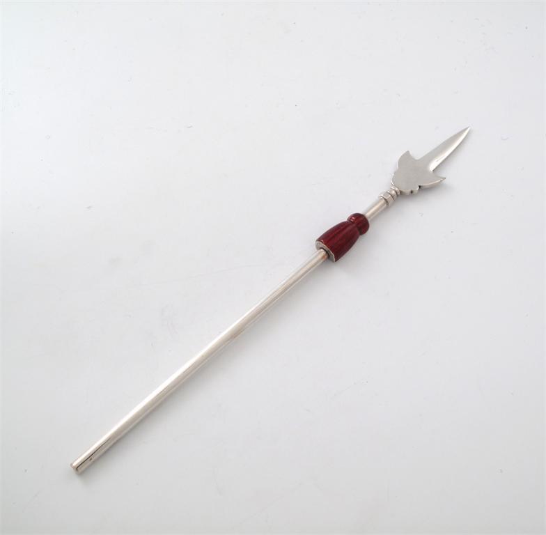 A novelty silver and enamel paper knife, by the Goldsmiths and Silversmiths Company, London 1926, modelled as a pike, with red enamel decoration, length 24cm.