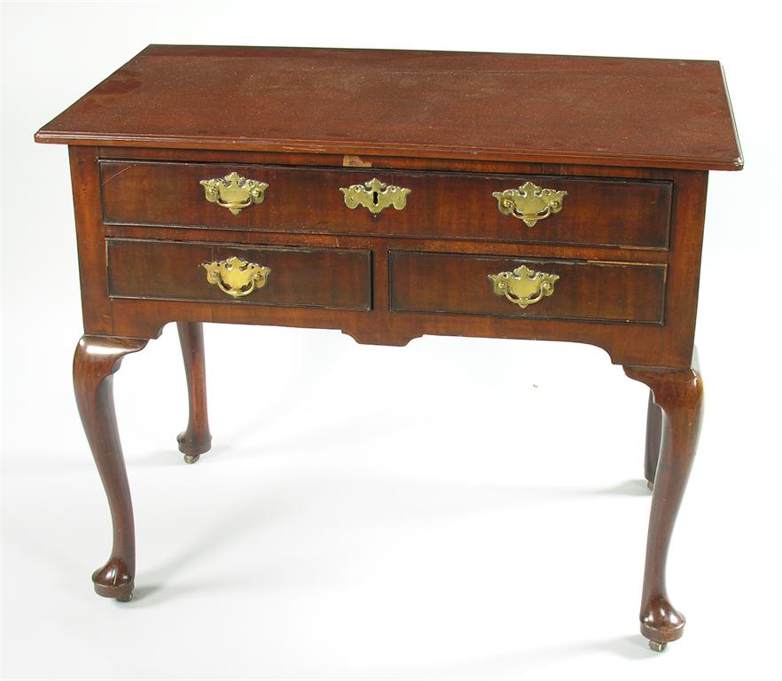 An early George III mahogany side table, the moulded edge top above one long and two short drawers fitted replaced brass plate handles, the cabriole legs on leather roller castors, 29in (73.6cm) h, 36.5in (92.6cm) w, 21.75in (55.2cm) d. The top possibly later.