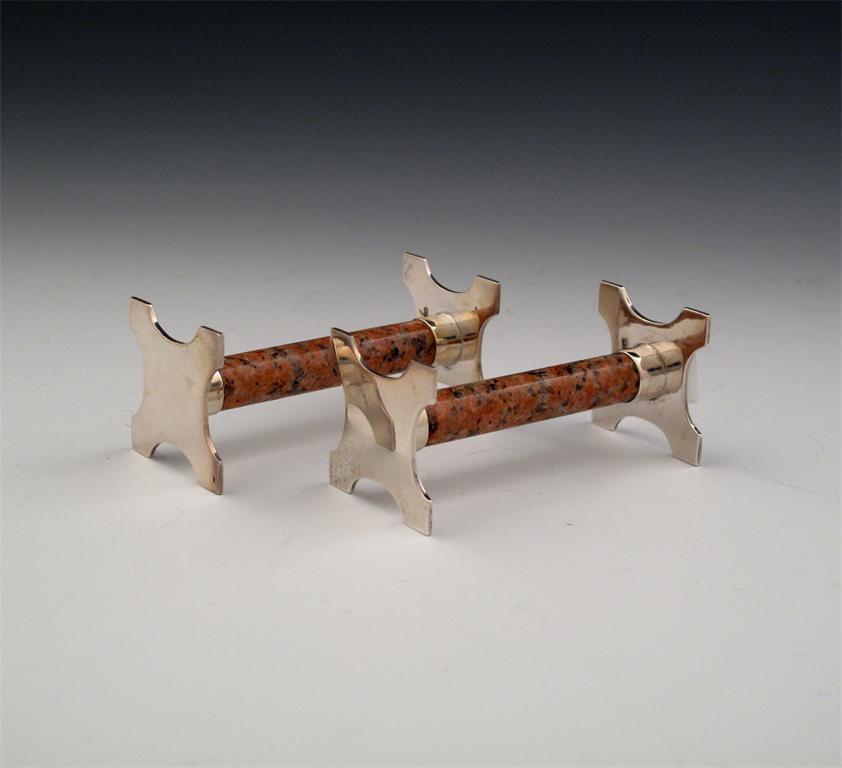 A pair of Australian silver mounted hard stone knife rests, by W. Drummond and Co, Melbourne, hard stone bodies, plain bracket mounts, length 7cm. (2)