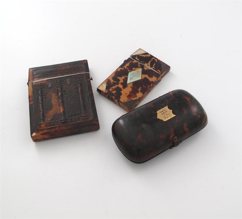 A small collection of tortoiseshell items, comprising: a card case of rectangular form, engraved with classical architecture, another card case, and a tortoiseshell purse, damage to all. (3)