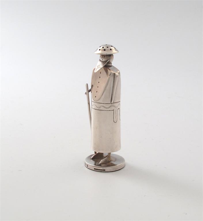 A late-Victorian novelty silver pepper pot, possibly modelled as Noah, by Saunders and Shepherd, Chester 1898, modelled in a standing position with a beard and holding a staff, on a circualr foot, height 8.8cm