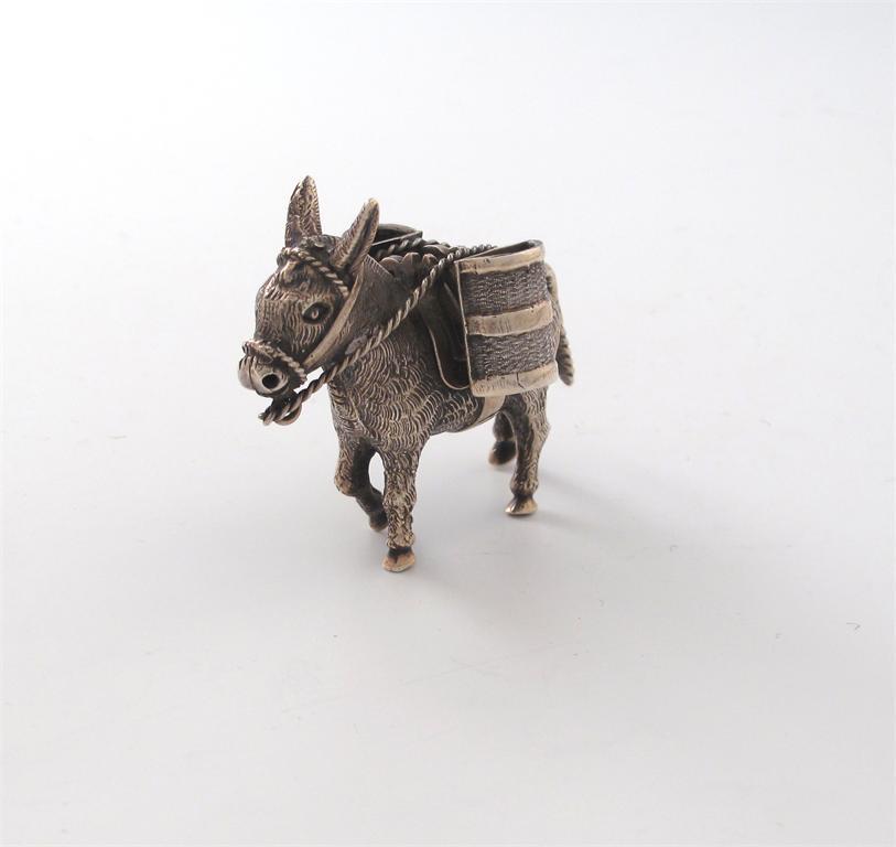 A Mexican metalware novelty toothpick holder, modelled as a donkey carrying two panniers, height 5.2cm.