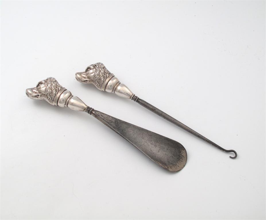 the mounts modelled as a spaniel head, with steel hook and and shoe horn. (2)