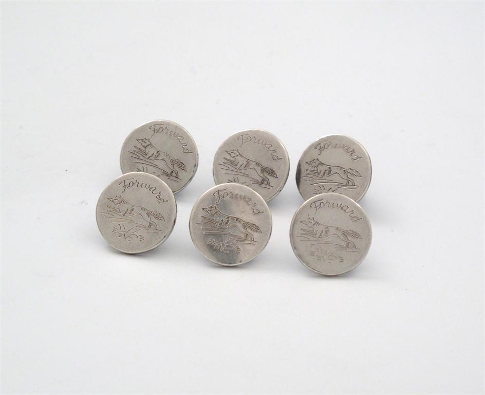A set of six modern silver buttons, by J H Hillcox, Birmingham 1978, circular form, engraved with fox and motto for Bramham Moor Hunt (Yorkshire). (6)