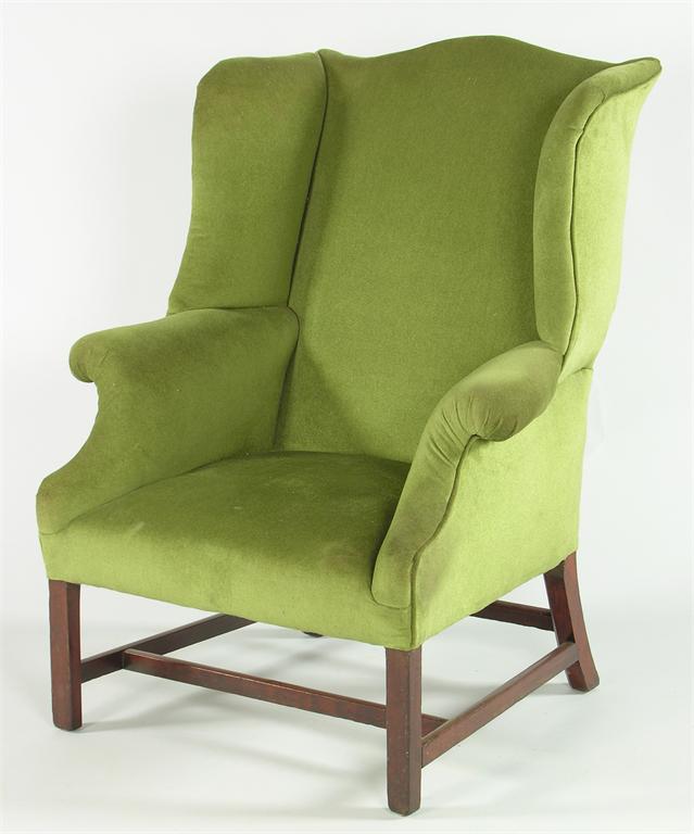 A George III wing armchair, later upholstered on mahogany square chamfered legs united by an 'H' stretcher.