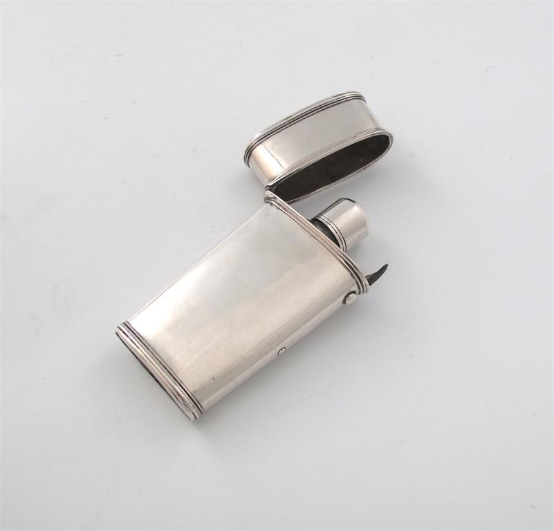 A continental silver scent bottle case, marked with a control mark, tapering oval form, hinged cover, reeded borders, the interior with a glass scent bottle, height 8.8cm.