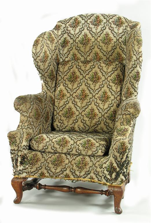 An early 18th century style wing armchair, on walnut cabriole legs united by a turned block H stretcher, the back legs stamped 'Gregory & Co'.