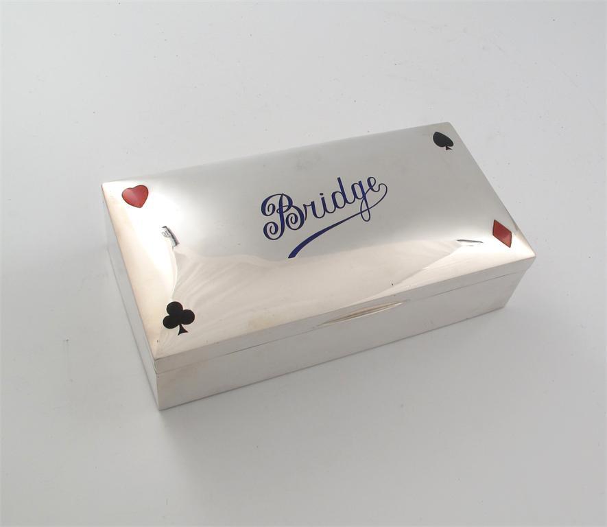 A silver bridge box, maker's mark worn, Birmingham 1922, rectangular form, the hinged cover enamelled in blue the word 'Bridge' and enamelled with the four playing card suits, cedar lined, length 20.4cm.