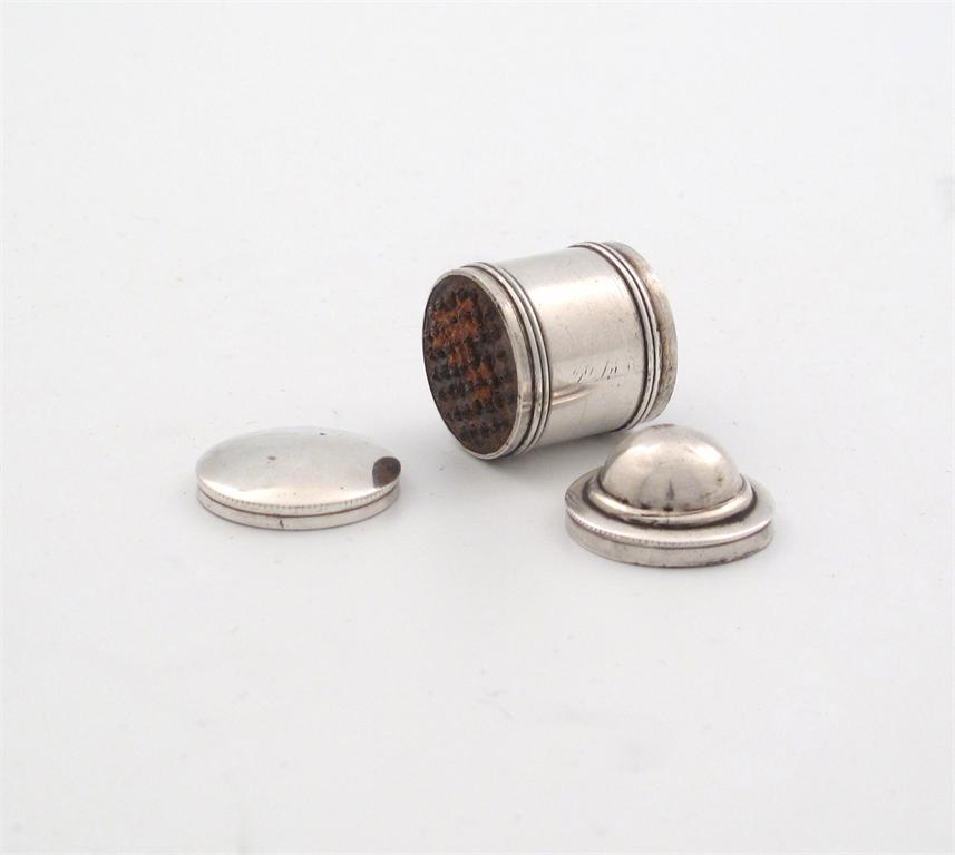 A George III silver nutmeg grater, by Samuel Pemberton, Birmingham 1801, cylindrical form, domed pull-off cover, height 3.2cm, approx. weight 0.5oz.