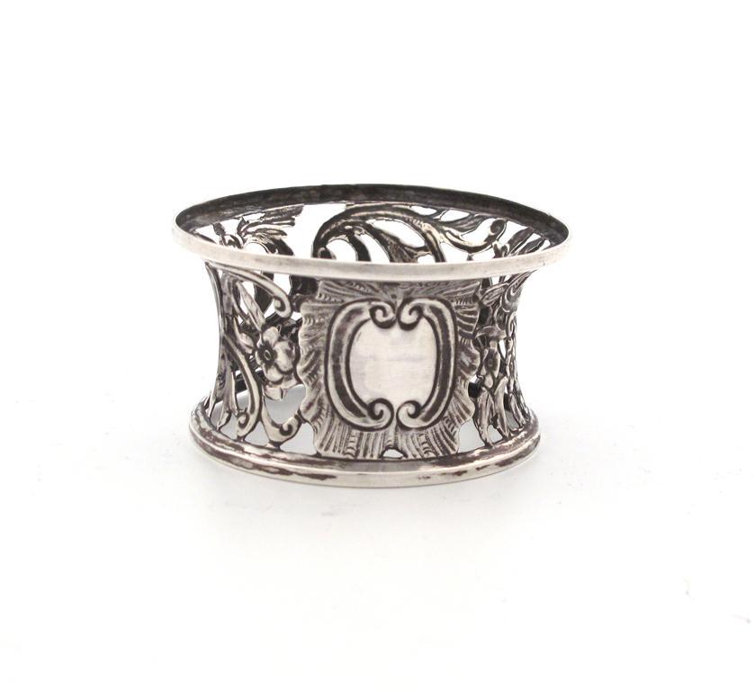 A late-Victorian silver miniature Irish dish ring, by E. Johnson, Dublin 1894, circualr form, pierced with scroll decoration and with a vacant cartouche, diameter 6.3cm, approx. weight 1oz.
