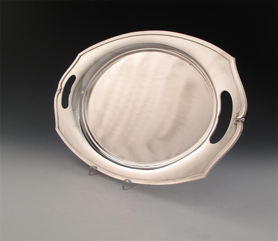 A metalware two-handled tray, marked International Sterling, shaped oval form, inset handles, moulded border, length 38cm.