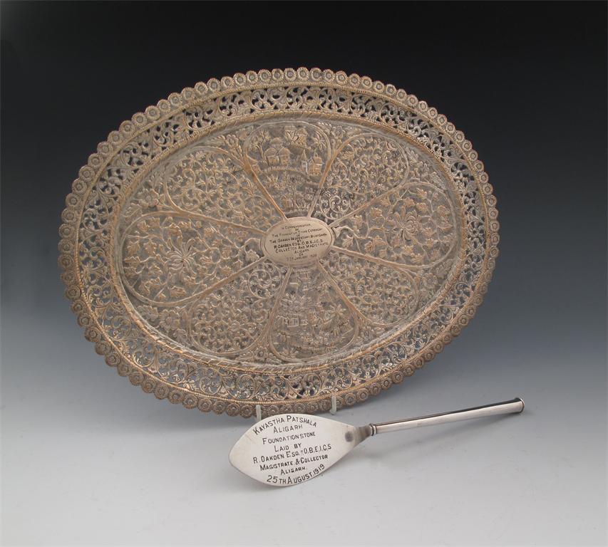 tapering circular handle, inscribed, 'Kayastha Patshala Aligarh Foundation Stone Laid By R. Oakden Esq. O.B.E I.C.S, Magistrate and Collector, Aligarh 25th August 1919.', plus an electroplated oval presentation tray. (2)