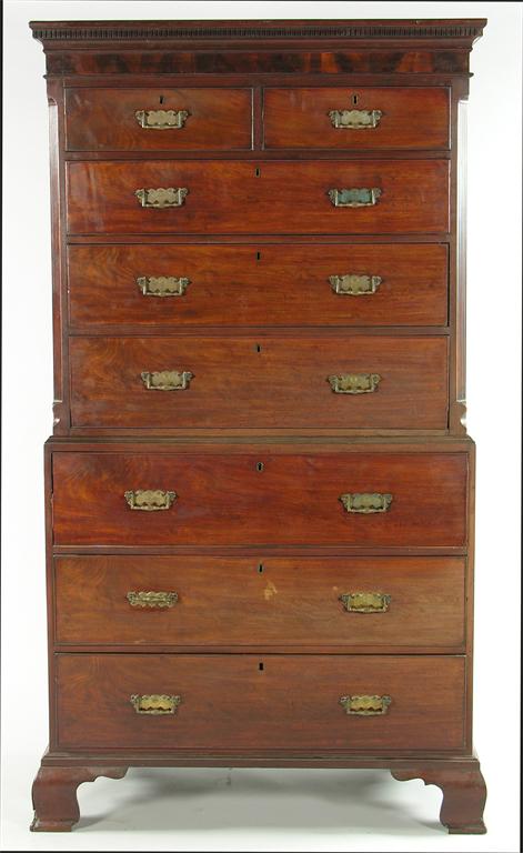 A George III mahogany secretaire chest on chest, the dentil corners above two short and three long drawers, flanked by fluted canted angles, the base with a fall revealing a central cupboard door flanked by pilaster compartments, drawers and pigeon holes, above two further drawers, all drawers with later brass handles on ogee bracket feet, 79in (200.6cm) h, 43.25in (110cm) w, 23in (58.4cm) d.
