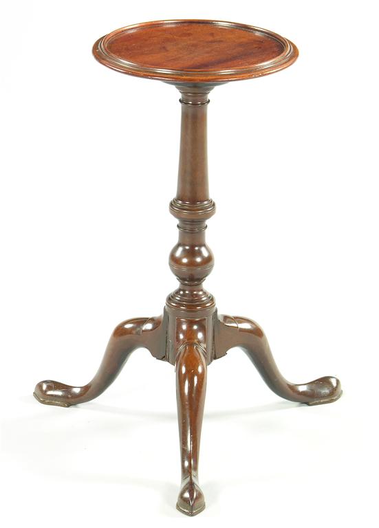 An early George III mahogany kettle stand, having a circular moulded edge dish top, the block later, 21.5in (54.5cm) h, 10.75in (27.3cm) dia.
