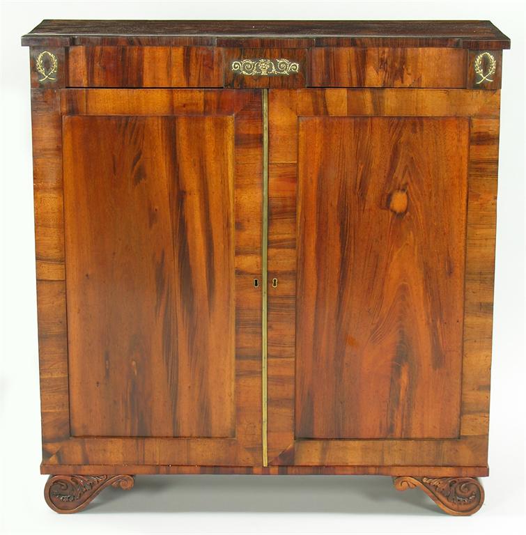 A George IV goncalo alves breakfront side cabinet, the top with rosewood banding above gilt metal mounts, the doors enclosing a later painted interior with shelves, 37in (94cm) h, 35.25in (89.5cm) w, 13.25in (33.5cm) d. Restoration.