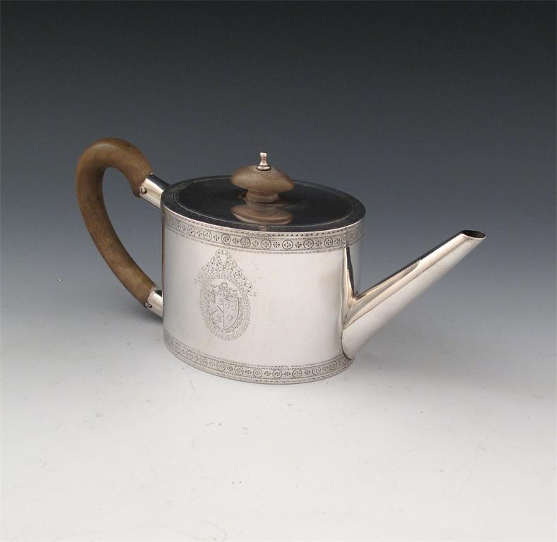 oval form, scroll handle, with borders of engraved decoration, engraved with an armorial, length handle to spout 25cm, approx. weight 16oz.