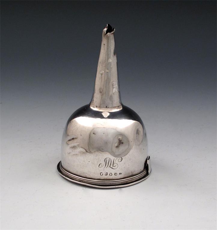 A George III silver wine funnel, maker's mark worn, London 1789, circular form, reeded border, engraved with a monogram, height 12.5cm, approx. weight 3oz.
