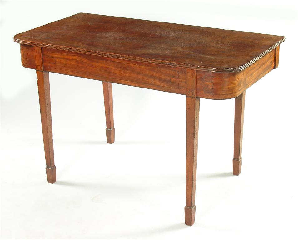 A mahogany console table, having a reeded edge top and an ebonized line inlaid frieze, 30in (76cm) h, 48in (122cm) w, 24.5in (62cm) d. Early 19th century and later dining table end.