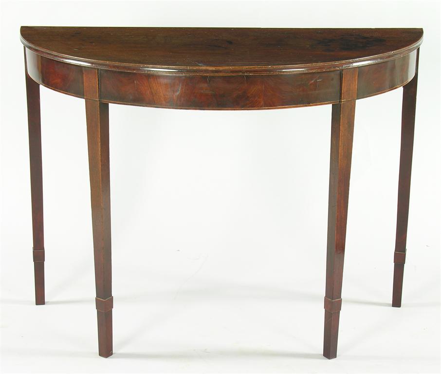 A mahogany demi lune console table, the moulded edge top a a veneered frieze inlaid stringing on square tapering legs with applied ankle mouldings, 32.25in (82cm) h, 43.75in (111cm) w, 21in (53.2cm) d. Early 19th century and later.