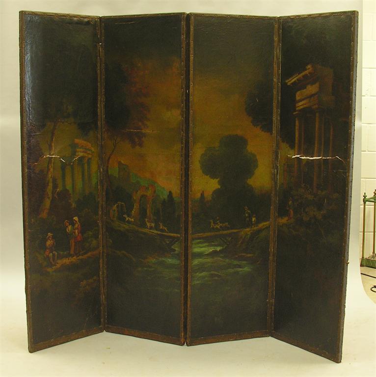 A 19th century painted leather four fold screen, decorated figures in a classical landscape, 72 x 20.25in (183 x 51.4cm) each panel.