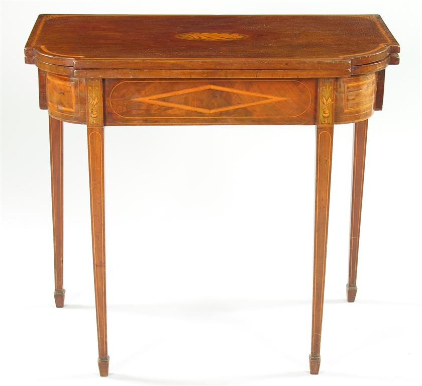 A mahogany breakfront tea table, inlaid marquetry satinwood banding and stringing, the surface inlaid parquetry banding, 19th century and later, 29.5in (73.6cm) h, 32in (91.2cm) w, 17.5in (44.4cm) d.