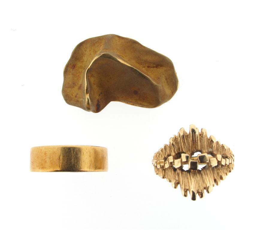 An 18ct gold abstract form brooch. An 18ct gold wedding ring. And a textured gold ring. 31g.