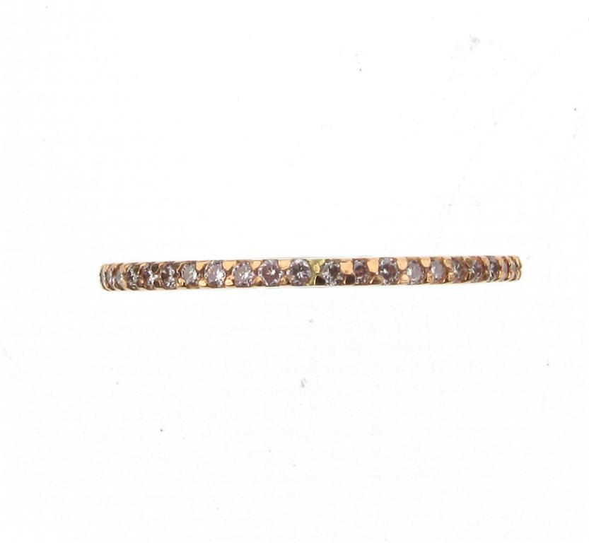 A diamond full circle eternity ring. The round brilliant cut diamonds weigh approximately 0.20cts and are set in pink gold. Size J.