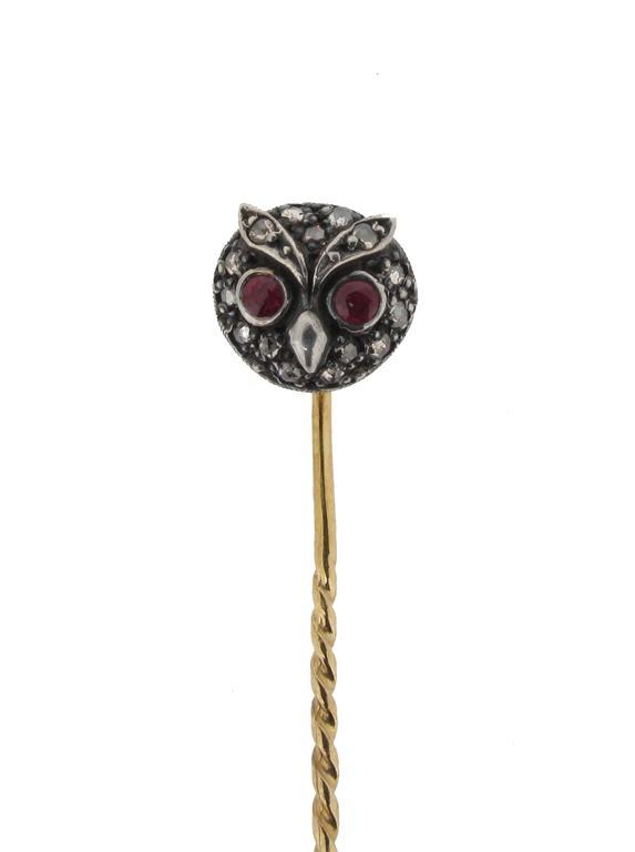 A stick pin in the form of an owls head. Pave set with rose cut diamonds and with ruby eyes. Set in silver and gold.