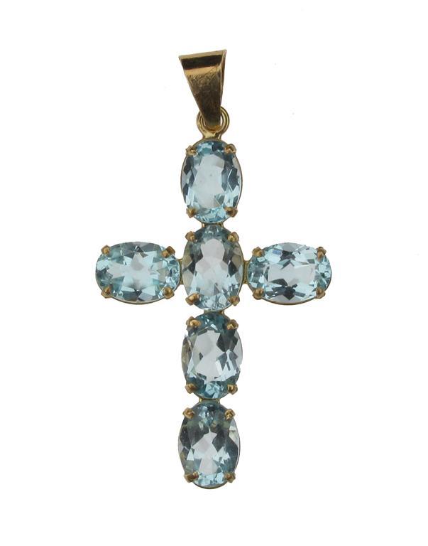 An aquamarine cross pendant. Mounted with six oval shaped aquamarines in gold. 3cm high.