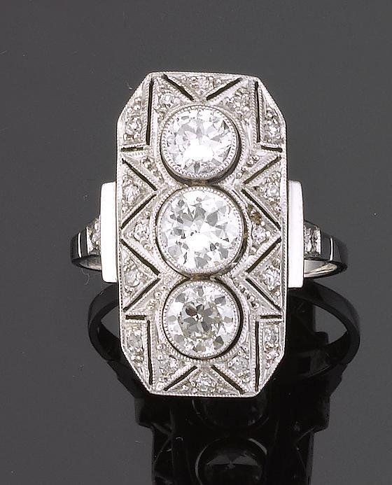 An Art Deco diamond set plaque ring. The three principle circular cut diamonds are millegrain set...