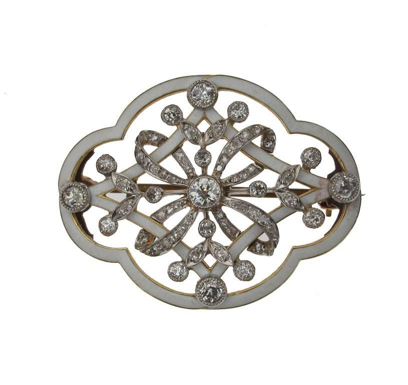 A Belle Epoque diamond and enamel brooch. The foliate bow design set with graduated diamonds and white enamel frame. 3.5cm wide.