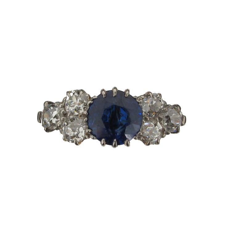A sapphire and diamond seven stone ring. The slightly oval sapphire is set with six cushion shaped shoulder diamonds in gold and platinum. Size M.
