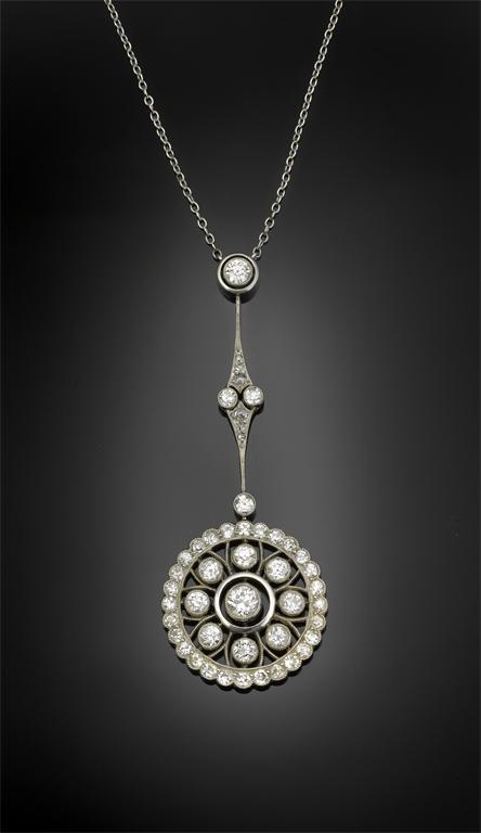 An Edwadian diamond set circular pendant. The centre circular cut diamond is set with two...
