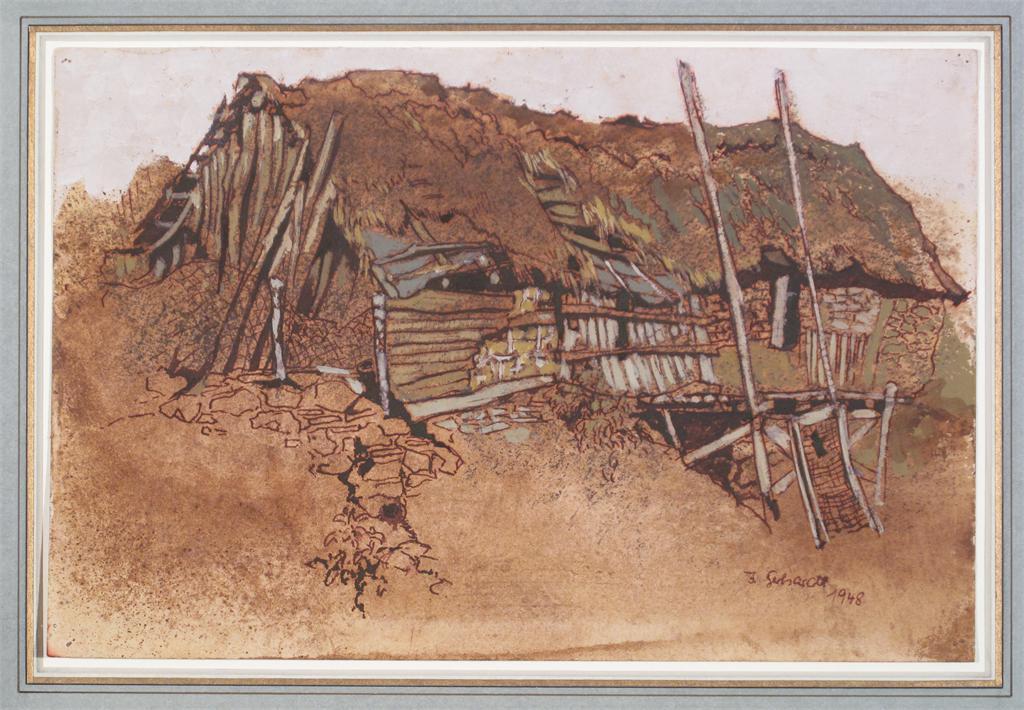 Ingrid Gerhardt (German 1925-2002) A derelict farmhouse Signed and dated 1948 Sepia washes over...