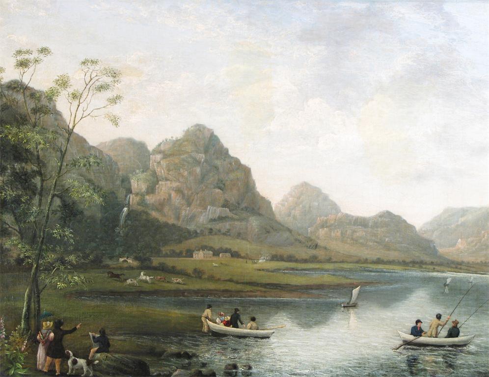 Jonas Gaunt (early 19th Century) Fishermen in a boat on a lake with figures on the shore