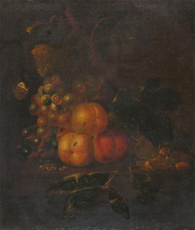 English School (19th Century) Still life of fruit and insects Oil on canvas laid on board