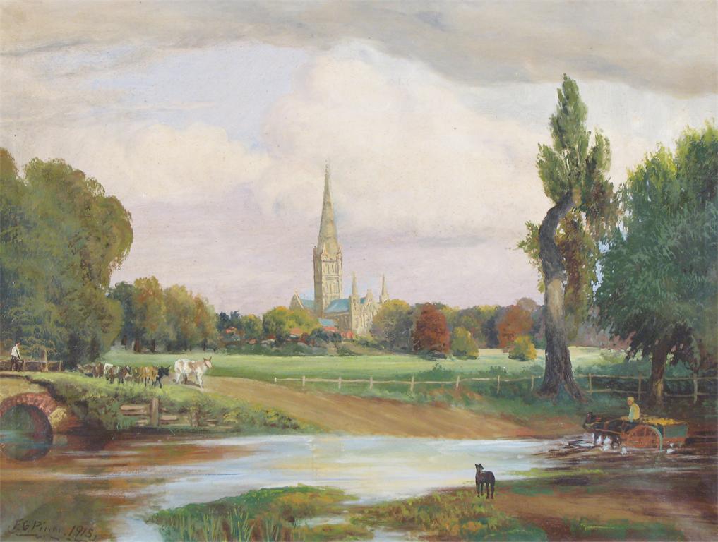F. G. Pimm (early 20th Century) A distant view of Salisbury Cathedral Signed and dated 1915 Oil...