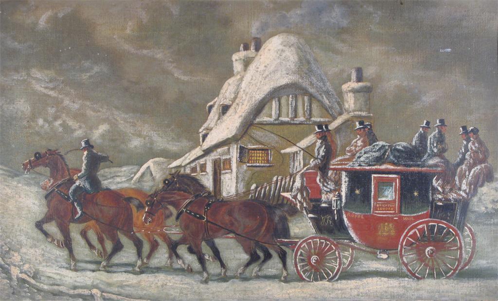 English School 19th Century London to Brighton Royal Mail coach in winter Oil on canvas 30.5 x...