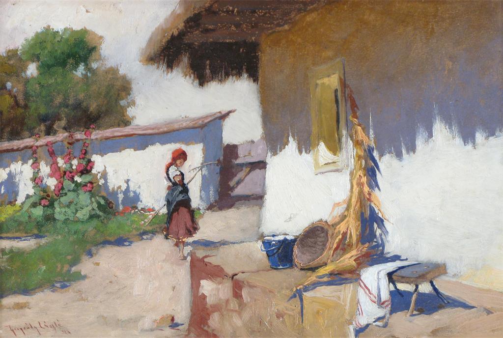 László Neogrady (Hungarian 1896-1962) Figure in a cottage courtyard Signed