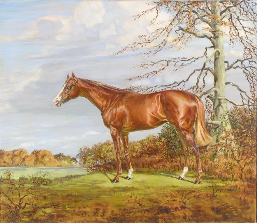 ‡Zita Hartigan (Irish b.1932) Bay hunter in a landscape Signed and dated 1964 Oil on canvas 66 x...